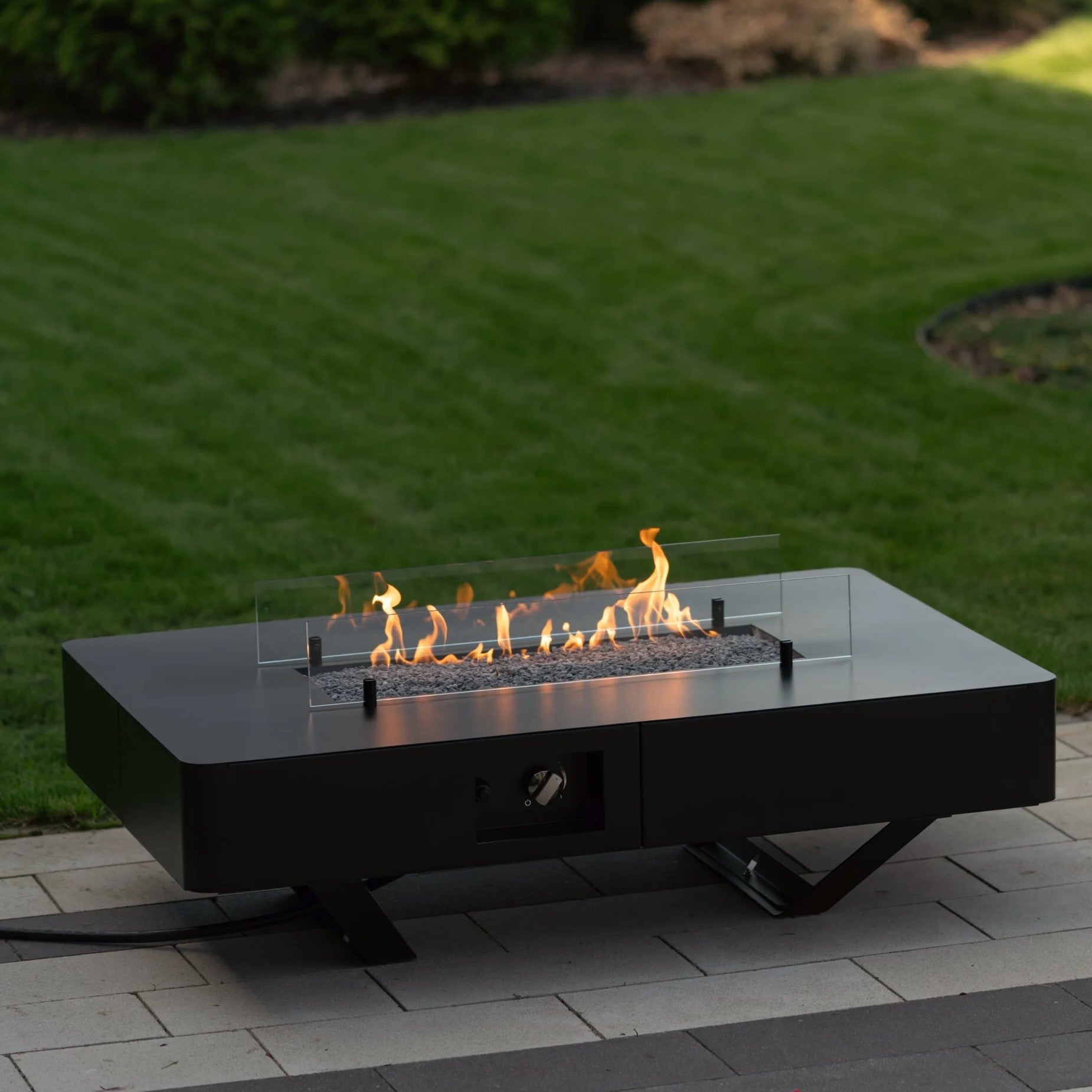 Rio Table er et elegant og funksjonelt peisbord for uteplasser, der et stilrent kaffebord er kombinert med en kraftig gasspeis i én helhetlig løsning. Den lange, lineære flammen skaper et naturlig midtpunkt på terrassen, skjermet av to herdet glasspaneler som holder flammen stabil i vind og gir et behagelig uttrykk.